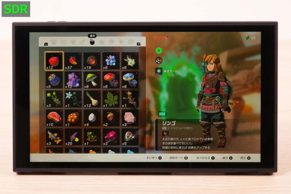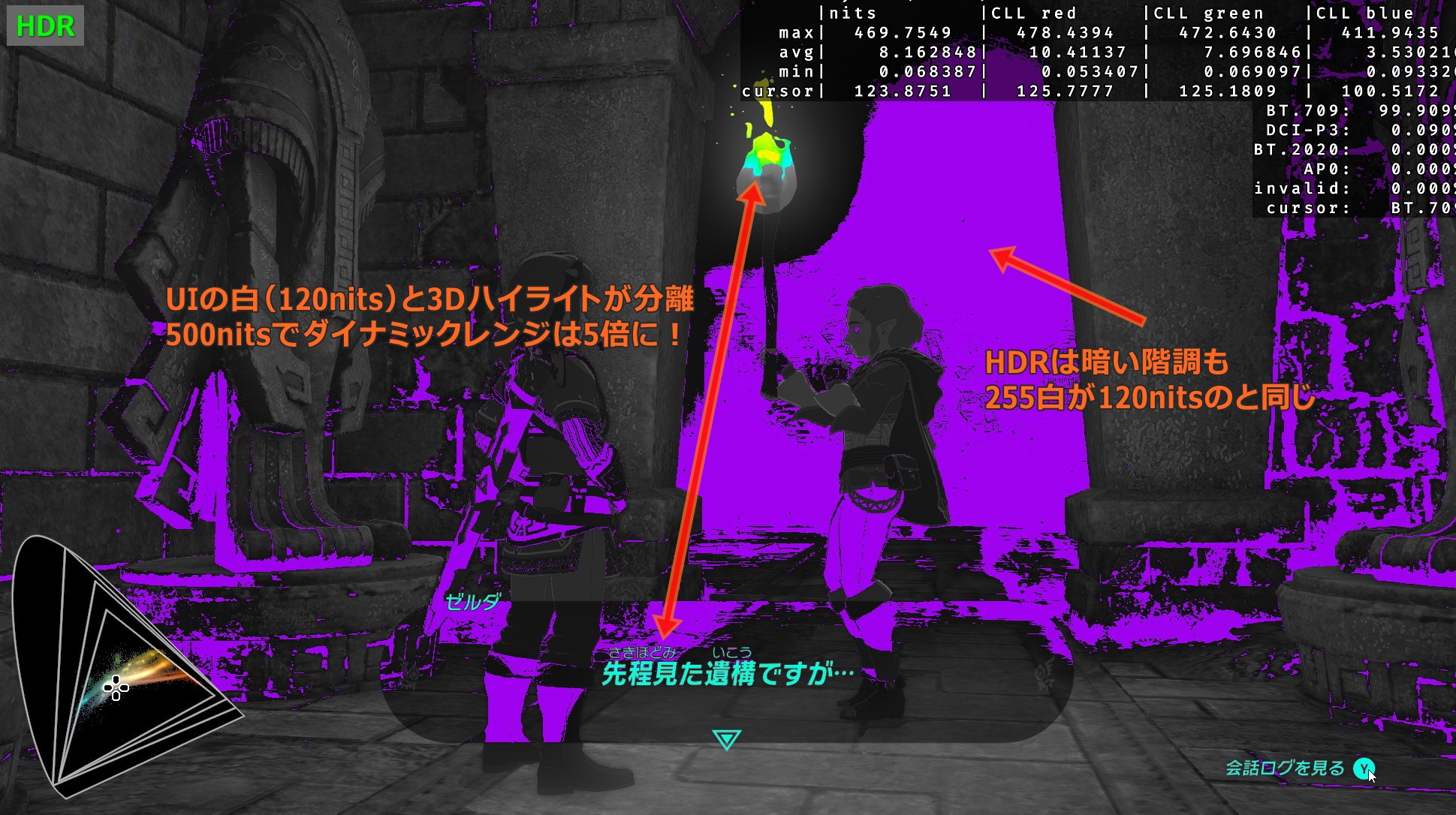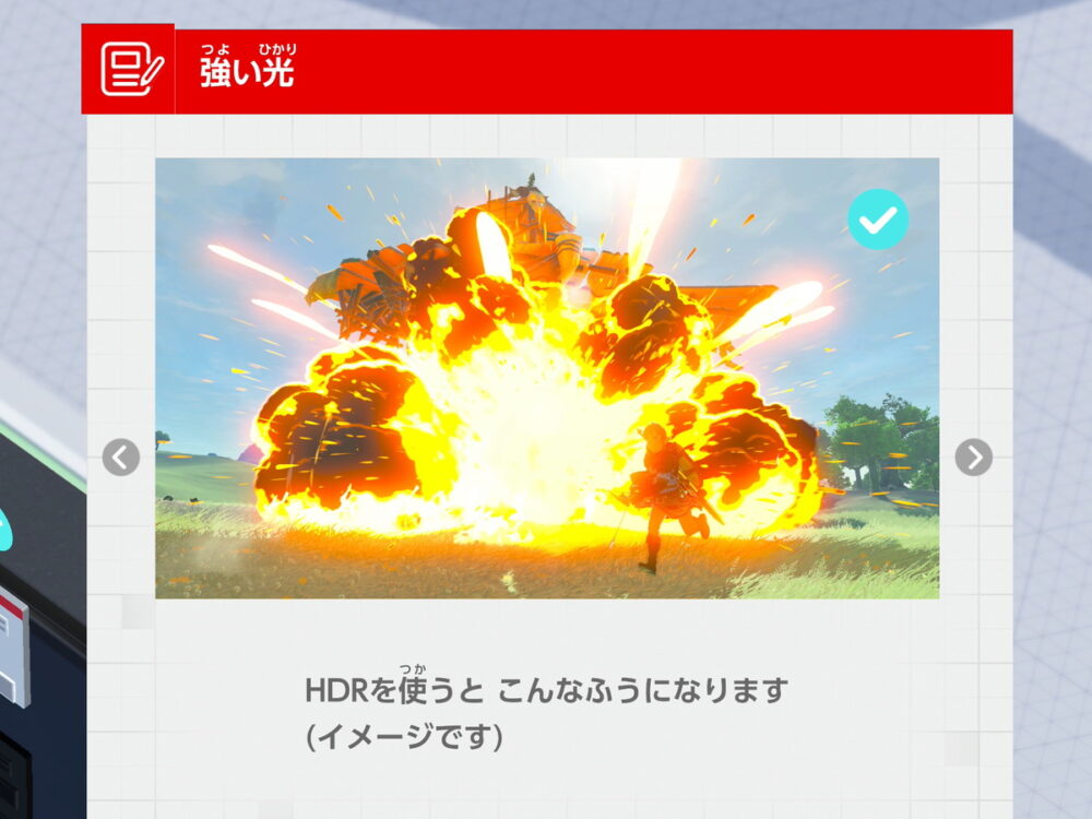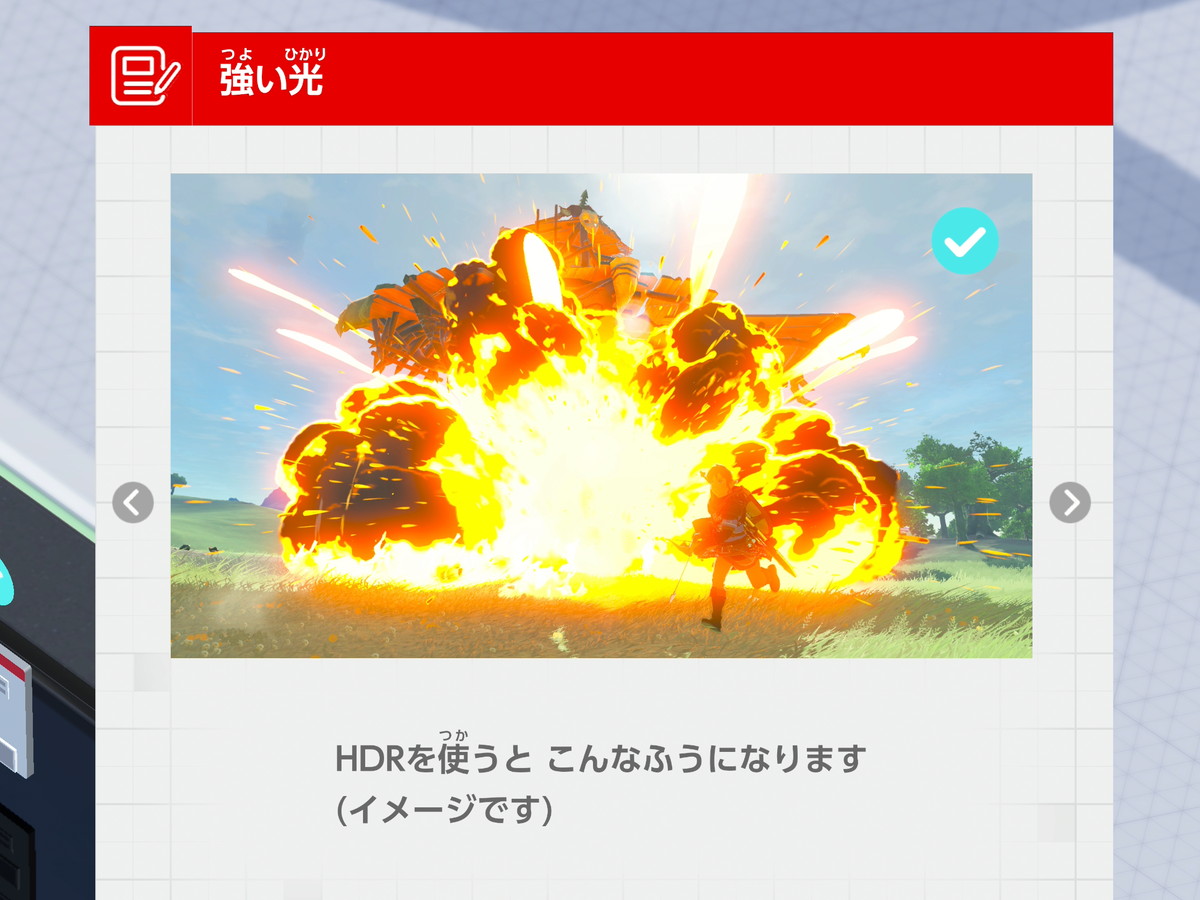 ゲームに依って変わる可能性もありますが、ゼルダの伝説 ブレワイ・ティアキン、マリオカート ワールドについてはHDR最大輝度はSDRベース輝度の4倍弱になるように制限されていました。