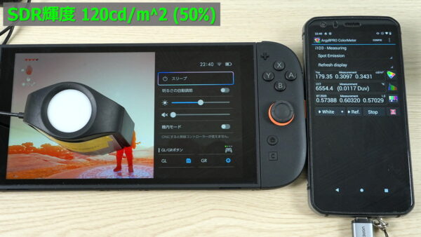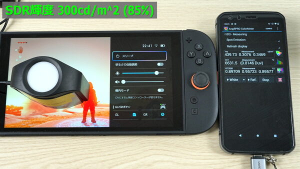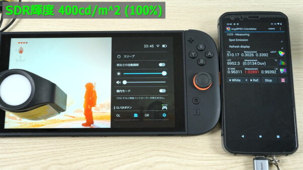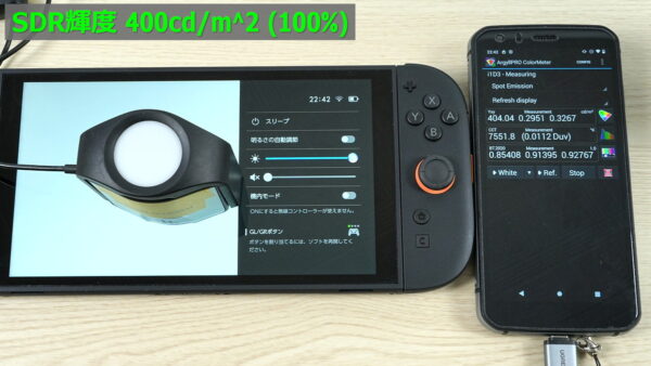 SDR白色が120~300cd/m^2になる設定において高輝度比率が実測で1.5倍に対して、明るさ設定を最大にした400cd/m^2では実測で1.2倍程度に下がってしまいます。この観点から言うとSwitch 2の本体付属ディスプレイの高輝度性能は足りていません。