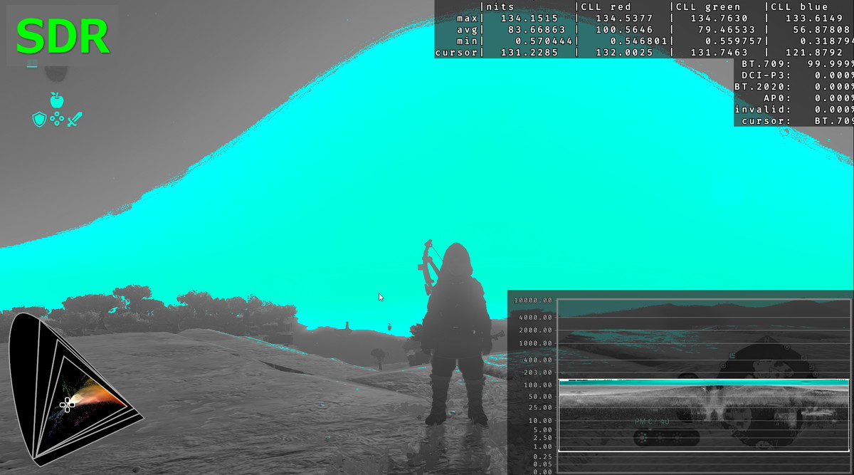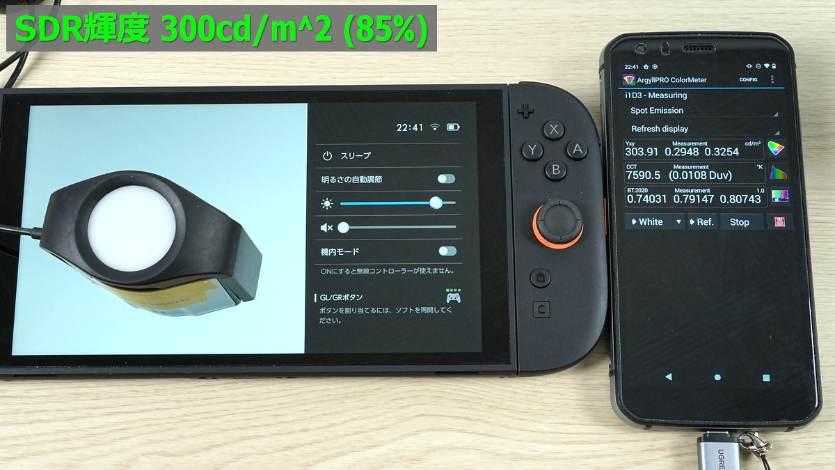 目が慣れるSDRベース輝度を基準にして、HDR最大輝度の比率が大きいほど、高輝度の階調表現はダイナミックに感じるので、室内などディスプレイ輝度を高くする必要がない環境であれば、SDR白色が120~300cd/m^2になる設定(50%~85%)でプレイすると、本体ディスプレイのHDR映像が最も綺麗になります。