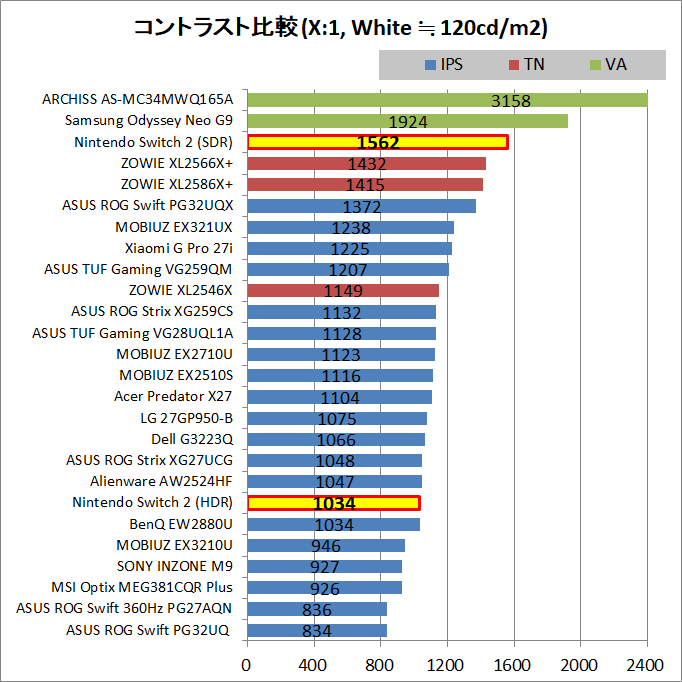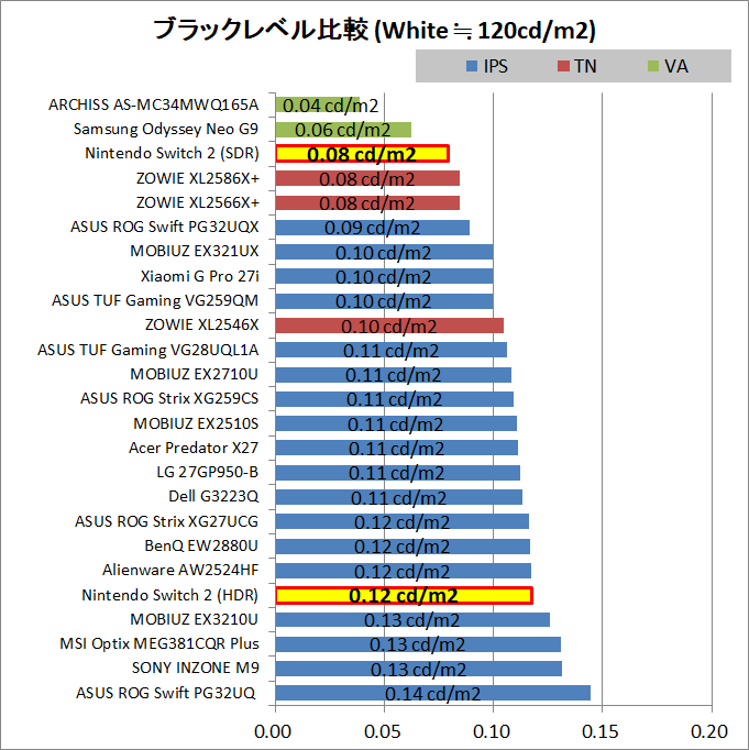 という特長によって、「Nintendo Switch 2」の本体付属ディスプレイはHDR表示モードはたかだか60cd/m^2程度の高輝度化(SDRベース輝度が120cd/m^2の場合)でも、SDR表示よりも高画質になります。