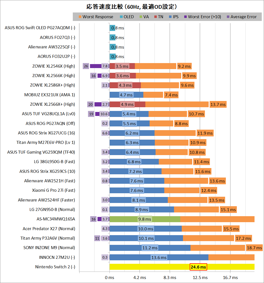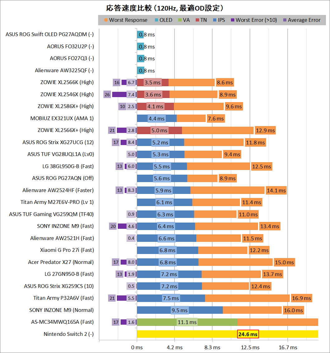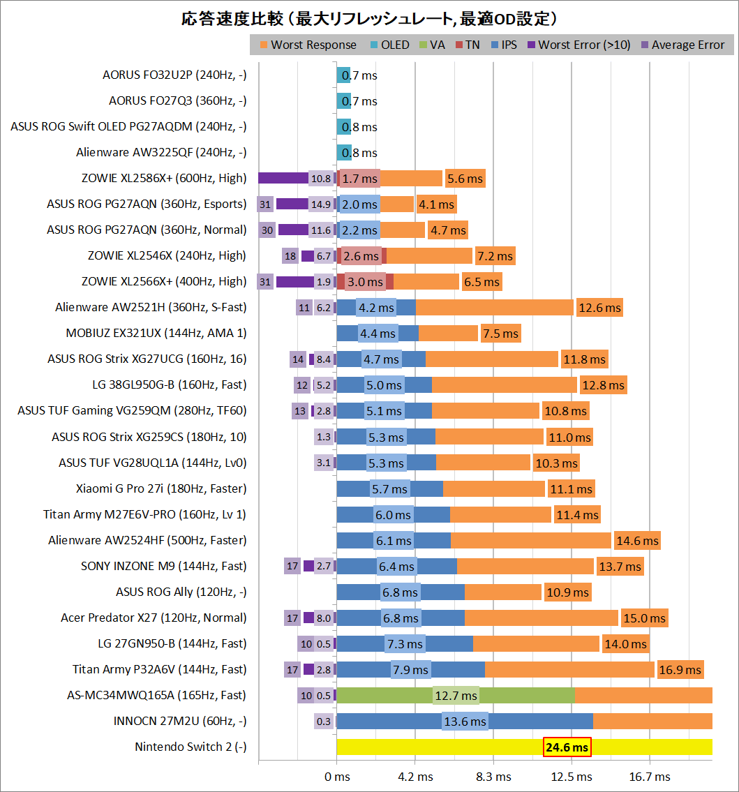 応答速度 | 理想的 | GTG 1~4msの非常に速いものから 10msを超えるかなり遅いものまで | 製品に依る速い | |