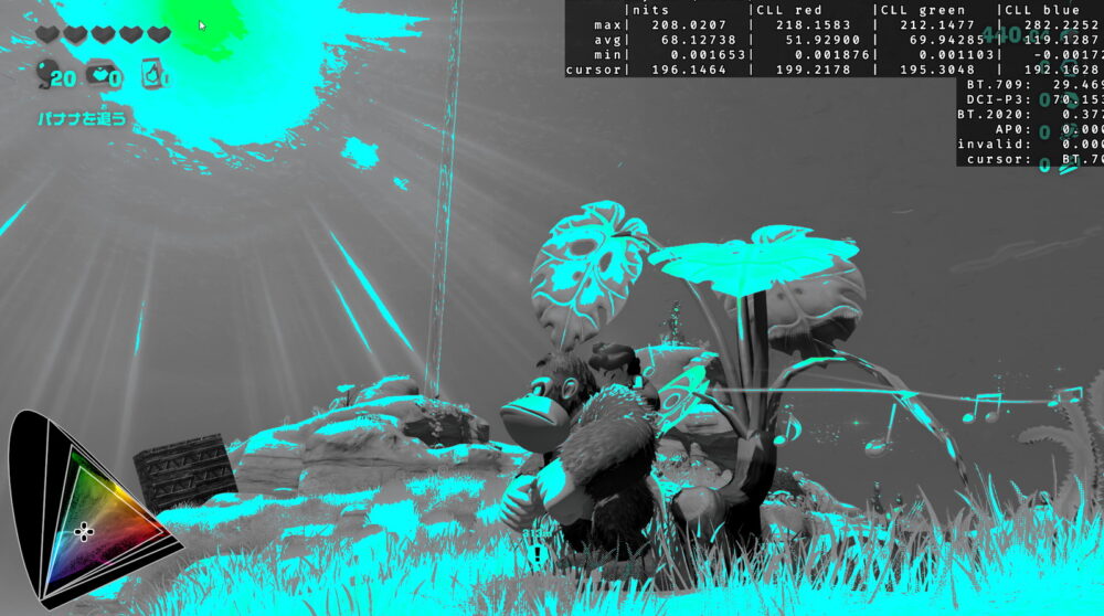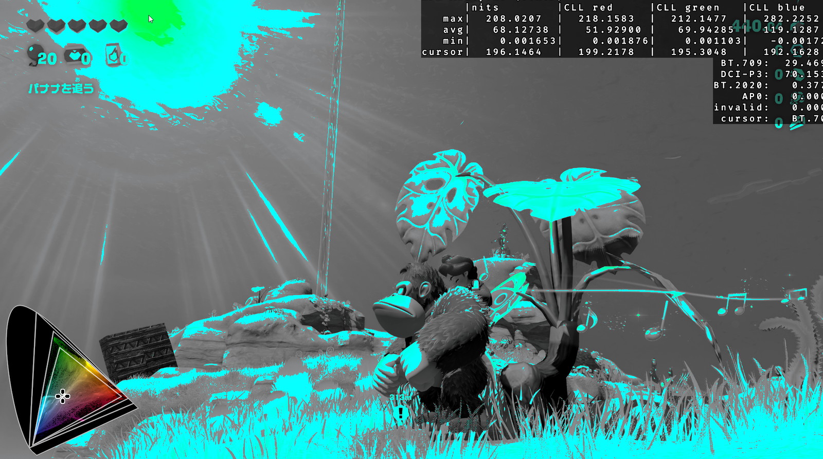 とりあえず、ドンキーコング バナンザは南国感というか原色バリバリなゲーム映像からも分かるようにDCI-P3の広色域カラーをしっかりと使ってくれます。(なぜかSDRベース輝度 120cd/m^2に対して、高輝度は200~300cd/m^2止まり)