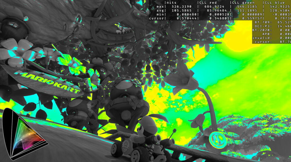 続いて、マリオカート ワールドもDCI-P3の広色域カラーを使ってくれます。こちらは高輝度域もしっかりとSDRベース輝度比で4倍弱です。