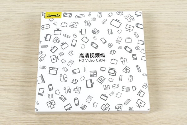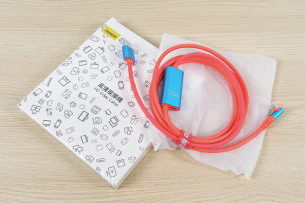 JEMDO製HDMIケーブル型ドックはシンプルに紙製パッケージに封入されていました。Type-C端子とHDMI端子にカバーがあって、保証シートが付いている以外に特に付属品もありません。