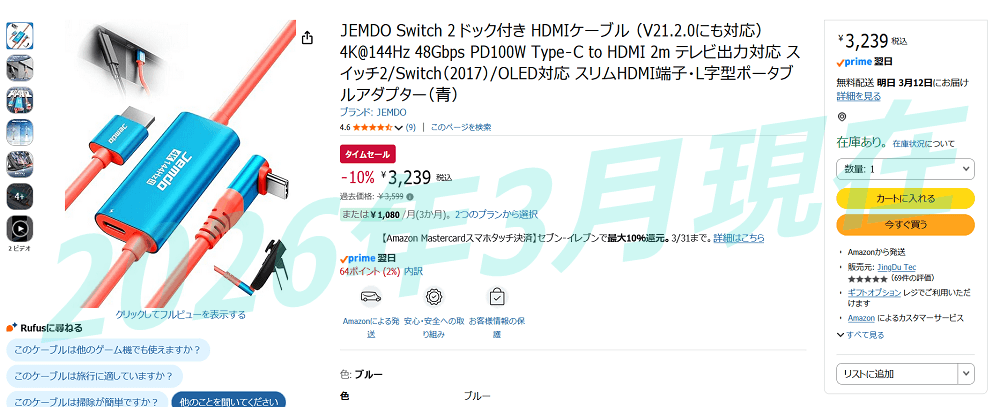 今回レビューするのはJEMDOというメーカーから出ているSwitch2用のHDMIケーブル型ドックです。