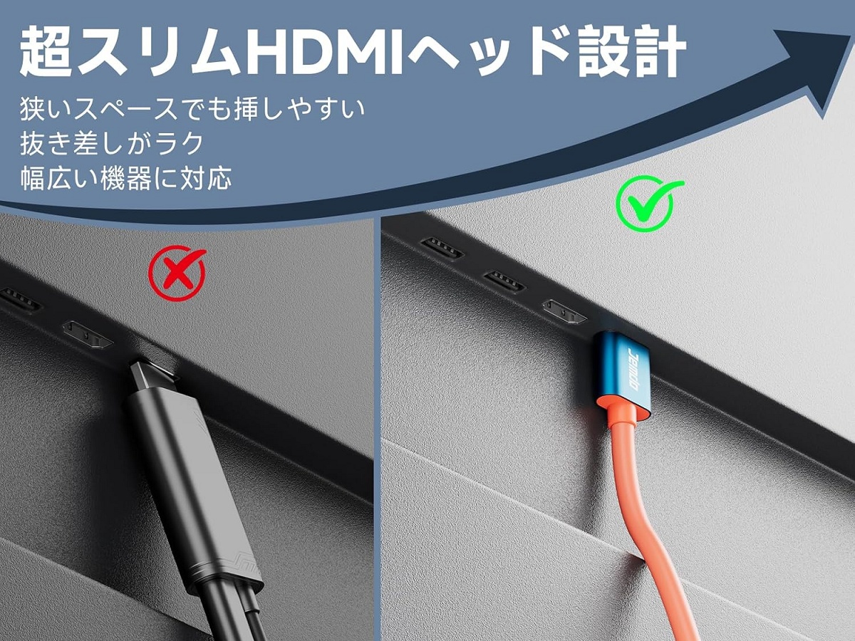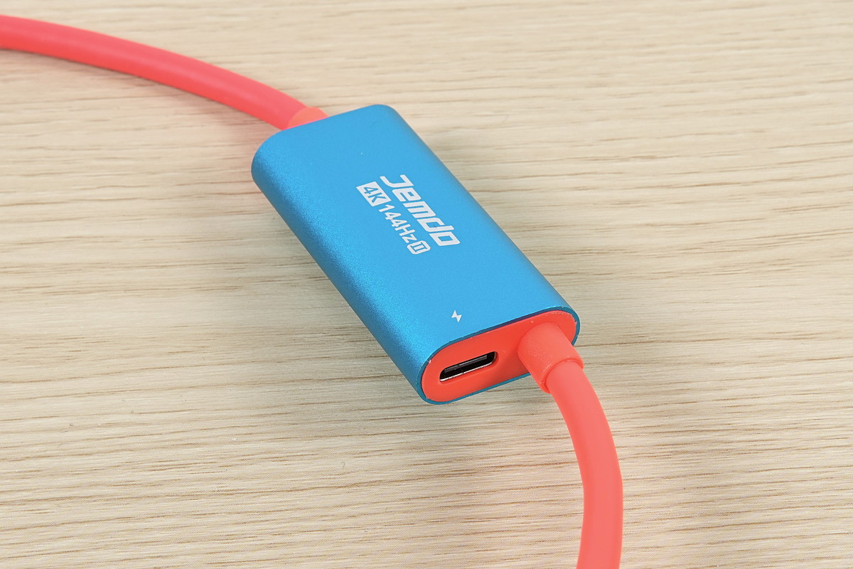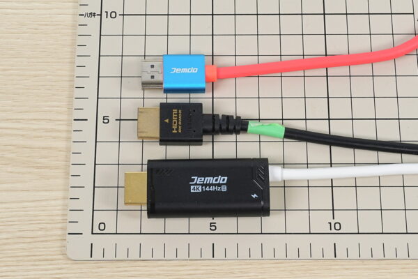 対応解像度・リフレッシュレートなど映像出力としての機能は従来の4K/144Hz版と全く同じですが、USB PD給電ポートがHDMIコネクタシェルに統合されていないので、HDMIコネクタのサイズが通常のHDMIケーブルと全く同じコンパクトサイズです。