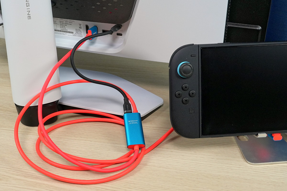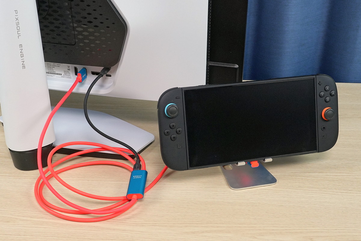 HDMI2.1対応でNintendo Switch 2をメインターゲットにした製品ですが、初代Switchイメージカラーのネオンレッド&ネオンブルーという派手なカラーリングです。