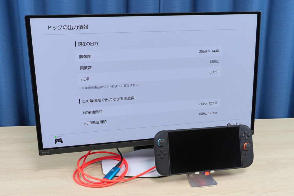 Amazonで販売されているサードパーティ製ドックはSwitch 2対応と書いていても正常に動作しなかったり、4K対応の表記でもHDMI2.0でHDR非対応だったりで詳しくない人だとハズレを掴まされやすいですが、同製品はちゃんとHDMI2.1対応となっており、4K/60Hz/HDR(10bit RGB)やWQHD/120Hz/HDRが正常に表示できました。