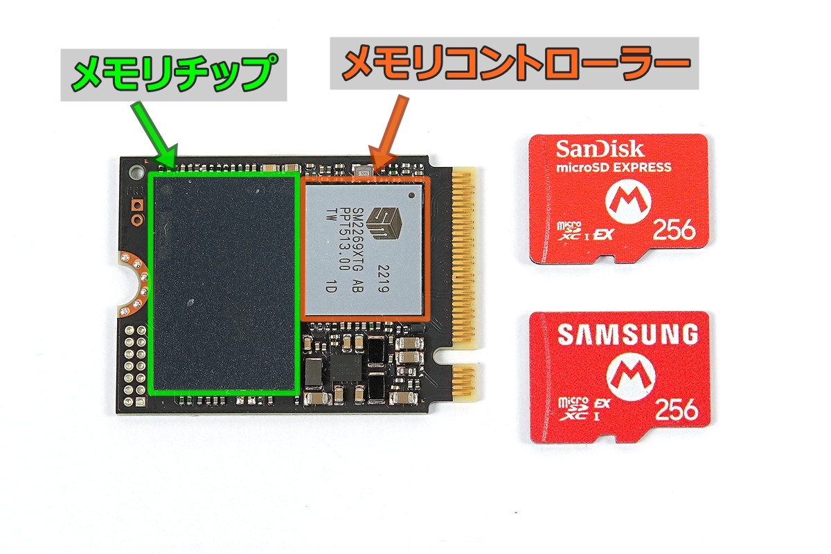 SSDやメモリーカードの主たる構成部品は、データを保存する記憶領域であるNANDメモリと、NANDメモリへの読み書きを行うメモリコントローラーの2つです。*SD ExpressやCFexpressのメモリーカードもPCI ExpressバスインターフェースとNVMe通信プロトコルを採用しているので、PC向けNVMe M.2 SSDとほとんど変わりません。