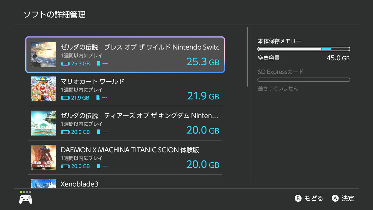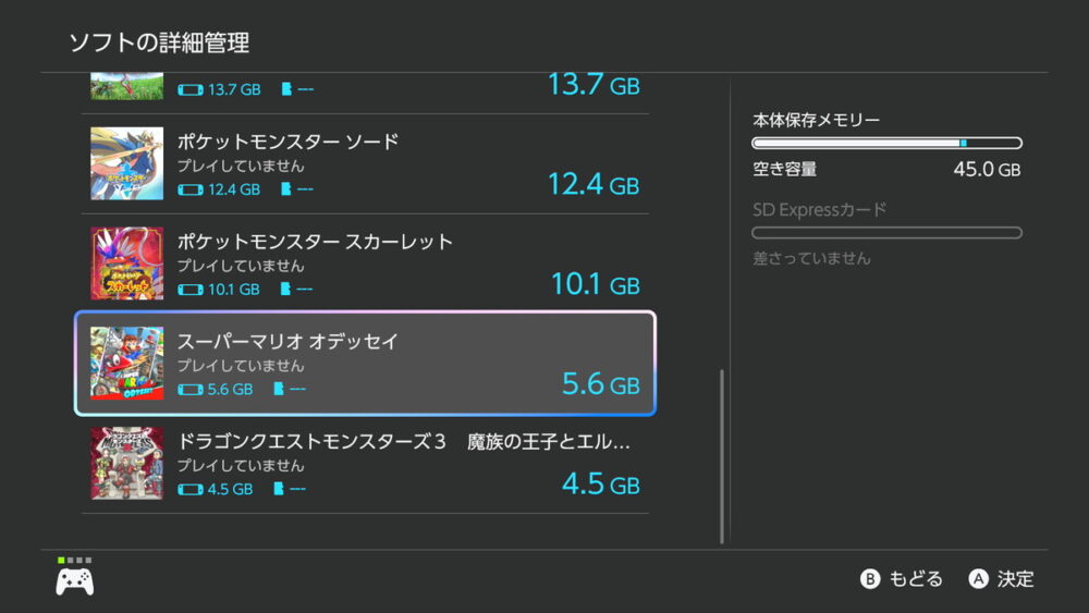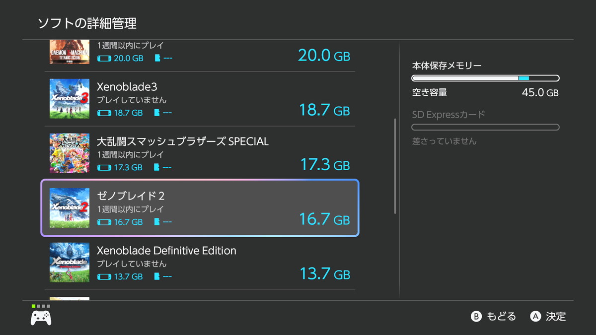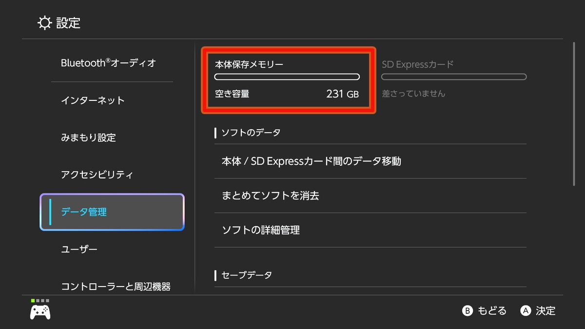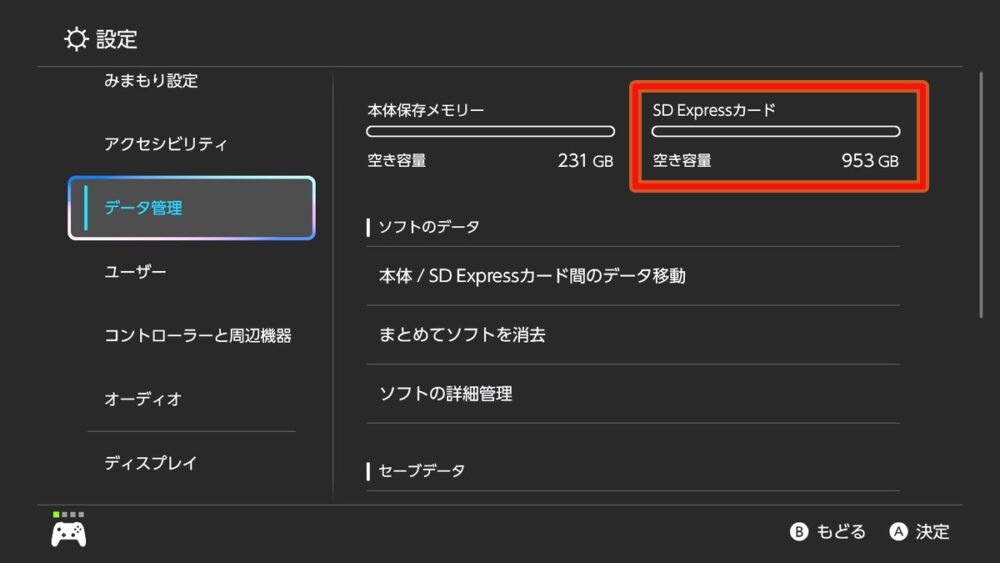 ダウンロードしたゲームはSD Expressカードへ優先的に保存されますが、ダウンロード完了後は「本体 / SD Expressカード間のデータ移動」の機能を使用すれば、任意に保存先を移動できます。
