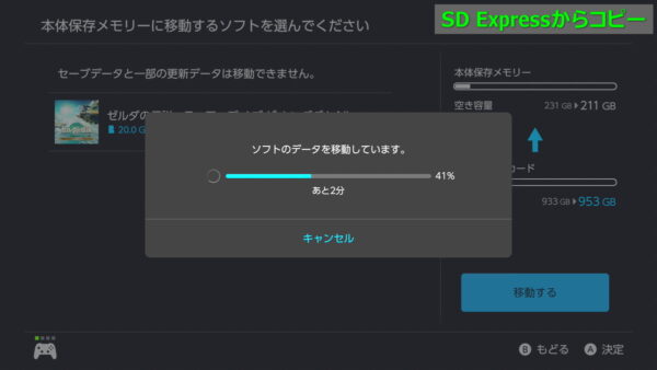 ニンテンドー eショップのオンラインサーバーからダウンロードすると20GB容量のゲームで約18分かかりますが、SD Expressカードからコピーすれば4分弱と1/4以下の時間で完了します。