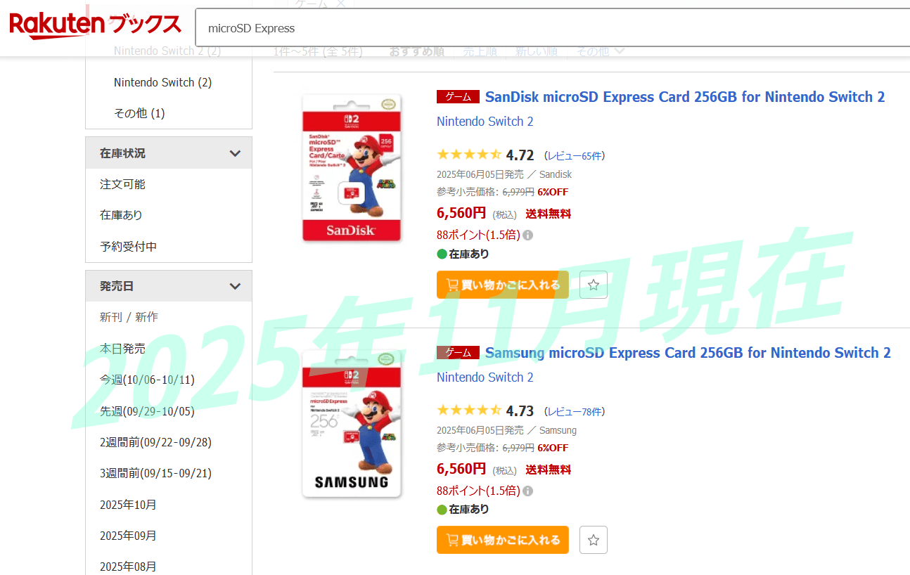 容量単価は2倍弱ですが、Switch 2専用ゲーム(or対応版)は初代Switchよりも容量が大きい傾向なので、インストールするゲームの数が同じでもより大きなメモリカード容量が必要になり、大きい容量のメモリカードを買うとなると予算は3~4倍以上になります。
