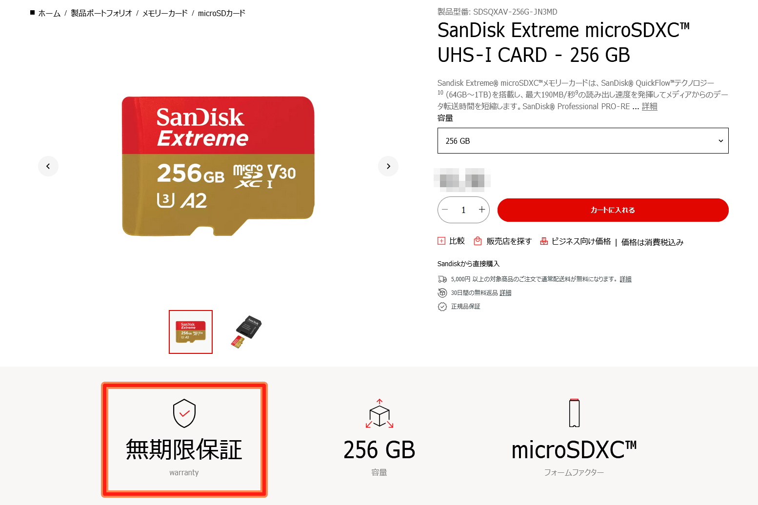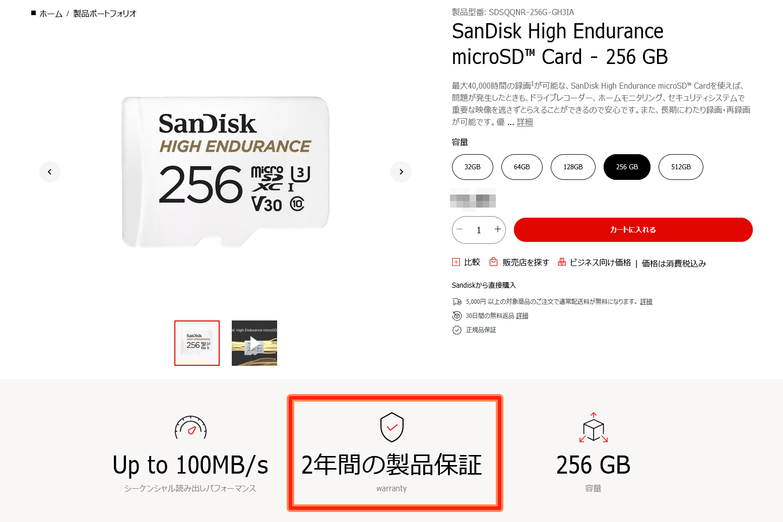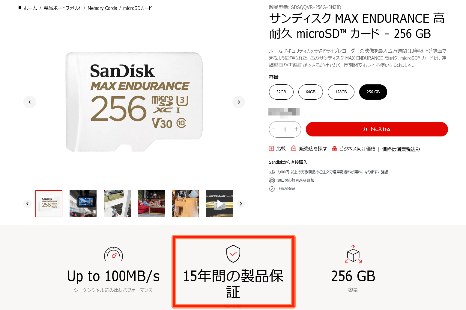 一方で高耐久モデルはメモリーカードの製品寿命をゴリゴリと削る常時書き込み発生が前提のメモリーカードなので、製品保証期間が一定に区切られています。