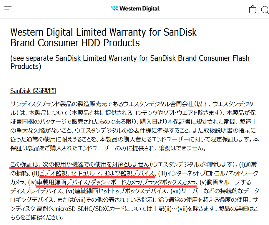 PC向けSSD製品だと総書き込み量(TBW)が条件になっていますが、メモリーカードはS.M.A.R.T.等の書き込み量を判断する機能がないので、『ドラレコ、監視カメラのように常時書き込みを行う機器で使用した場合は除く』というような例外規定が設けられています。