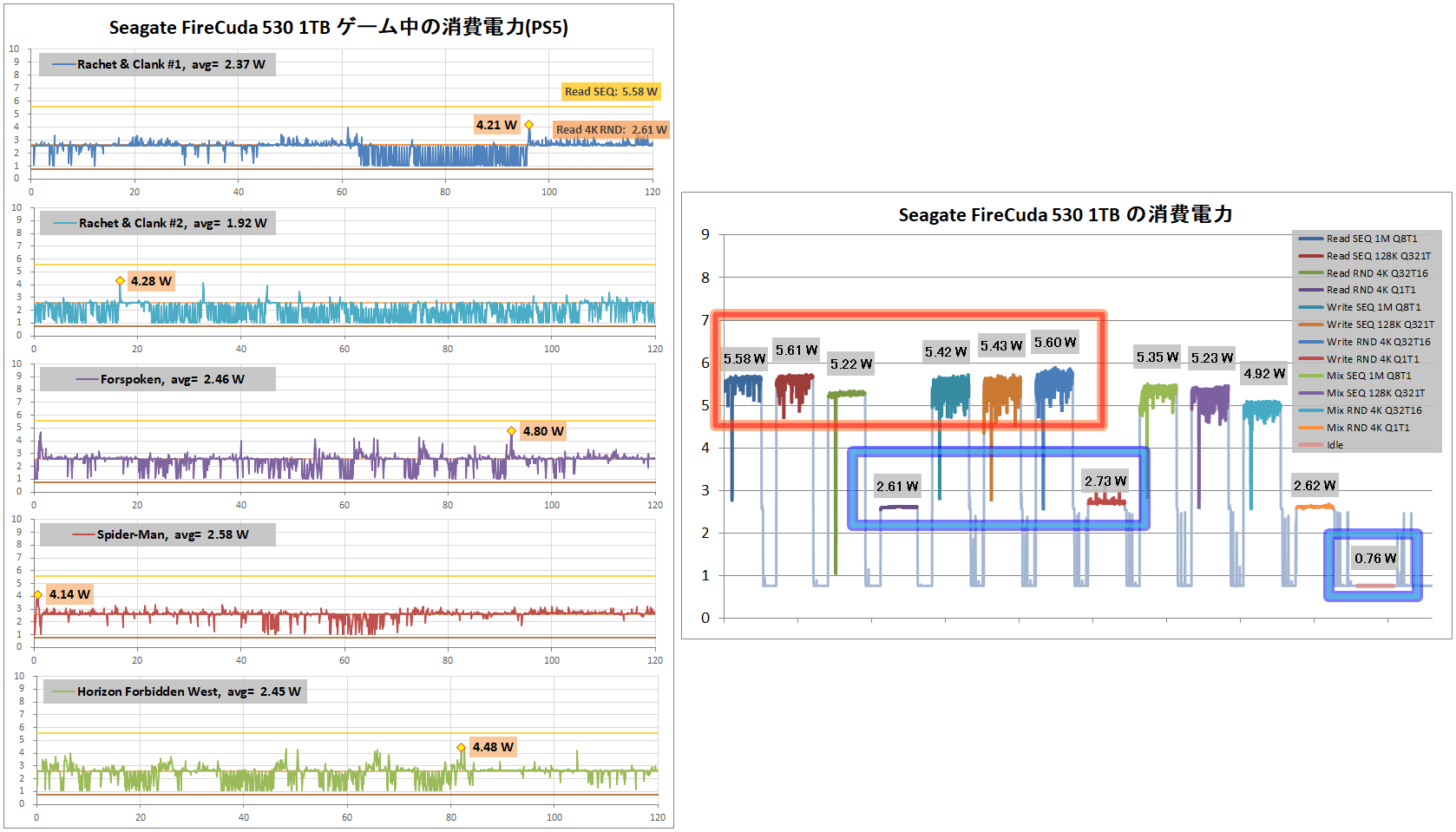ゲーム中のストレージ消費電力は基本的にCrystalDiskMarkで言うところの4Kランダム(Q1T1)読み出しとアイドル状態の消費電力を行き来する感じになります。