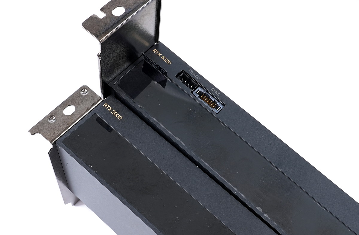 あとはGPUクーラー側面を見ると、NVIDIA RTX 4000 SFF AdaにはPCIEブラケットのすぐ傍にだけQuadro Sync 2用、ステレオシャッター用のコネクタが実装されていますが、「NVIDIA RTX 2000 Ada」は同機能に非対応なので実装なしです。