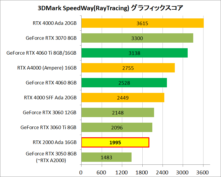 「NVIDIA RTX 2000 Ada」のGPU性能はGeForce RTX 3060 12GBと同程度です。