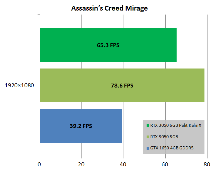 Assassin’s Creed Mirage(高設定プリセット、モーションブラー:オフ、適応品質:オフ、TAA:クオリティ)に関する「Palit GeForce RTX 3050 KalmX 6GB」を含めた各グラフィックボードのベンチマーク結果です。