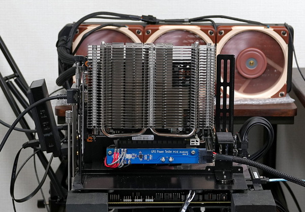 グラフィックボードの消費電力測定には、当サイトの検証に使用するためワンオフで特注した測定ツール「GPU Power Tester」を使用しています。GPU Power TesterはPCIEスロット経由とPCIE補助電源の消費電力を直接に測定しているので、シンプルにグラフィックボードそのものの消費電力をしることができます。