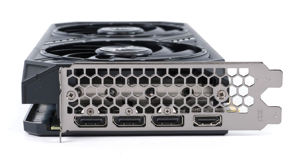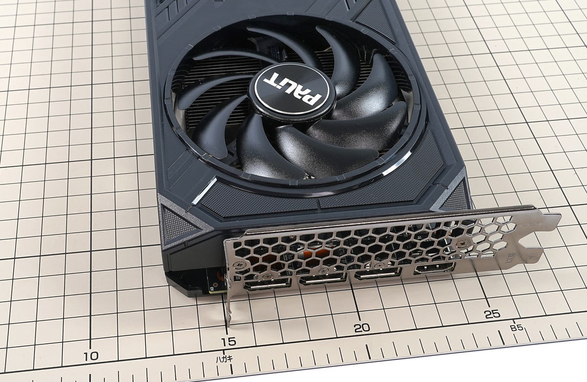 「Palit GeForce RTX 4070 SUPER Dual」のビデオ出力はリファレンス仕様と同じくHDMI2.1×1、DisplayPort1.4×3の4基が実装されています。