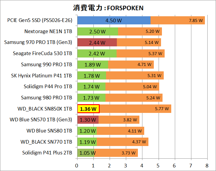 ここまでの説明から当然ですが、ゲーム中のSSD消費電力はCrystalDiskMarkの中では連続アクセスではなく4Kランダムの消費電力に比例し、「WD_BLACK SN850X 1TB」はゲームシーンなら省電力、低発熱なSSDという評価になります。