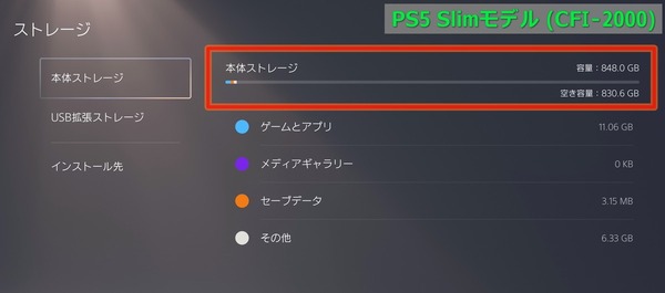 PlayStation 5 Slimモデル(CFI-2000)は本体ストレージ容量が1TBに増量されていますが、ユーザー領域は848GBです。