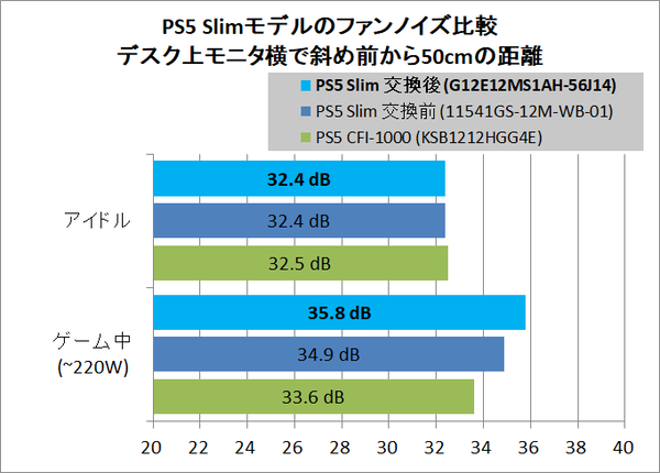 距離が近すぎるので実用的な意味はありませんが、正面から15cmの距離でゲーム中のファンノイズを確認してみると、2.5~4.0dB程度の差があったので、PS5 Slimモデルと初期型のゲーム中のファンノイズに差があり、PS5 Slimモデルのほうがファンノイズが大きいことは間違いありません。