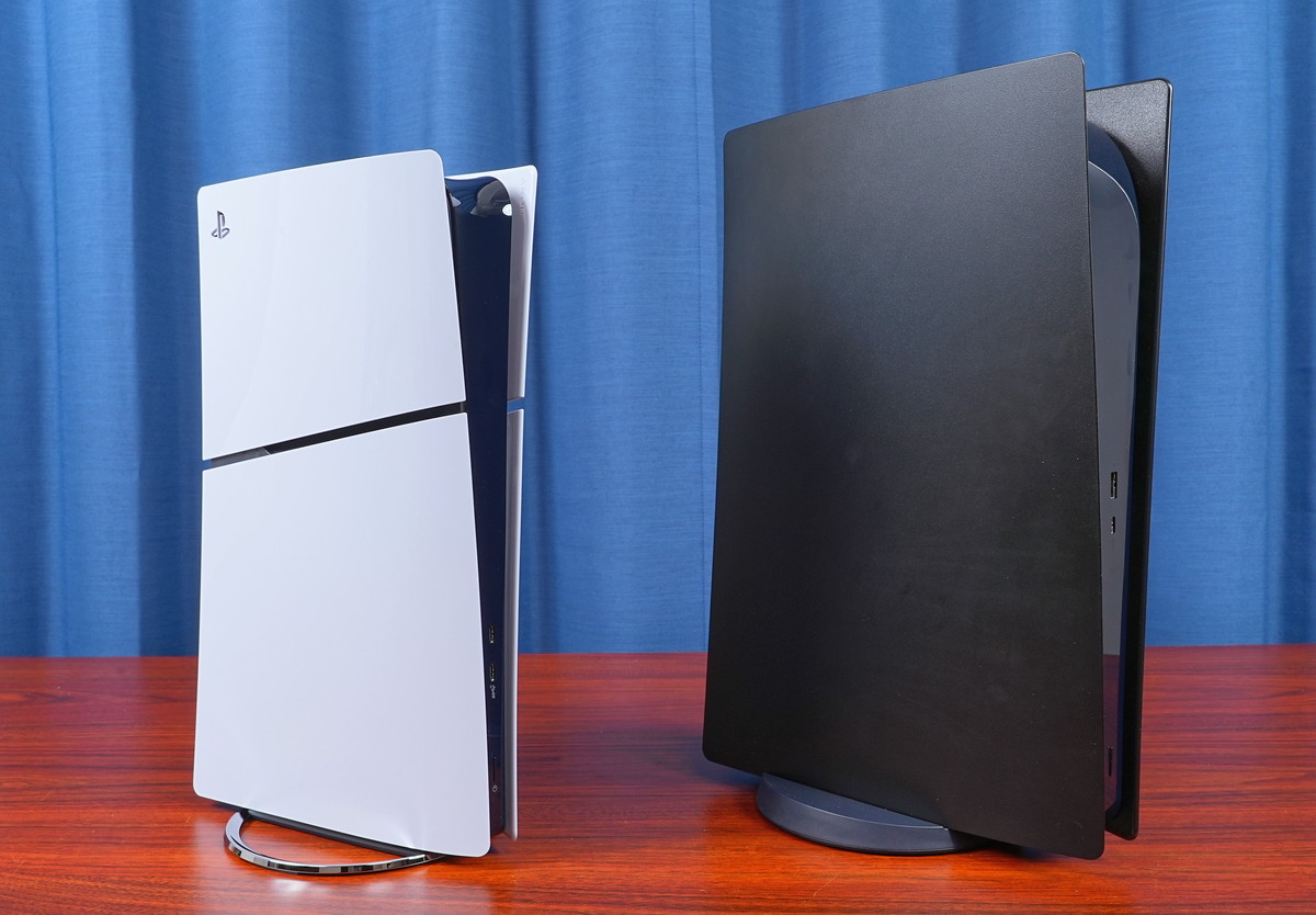 なおPlayStation 5 Slimモデルには横置きスタンドしか付属しないので、別売りの純正縦置きスタンドを装着した状態で比較しています。初期型PS5は付属品の縦置きスタンドです。