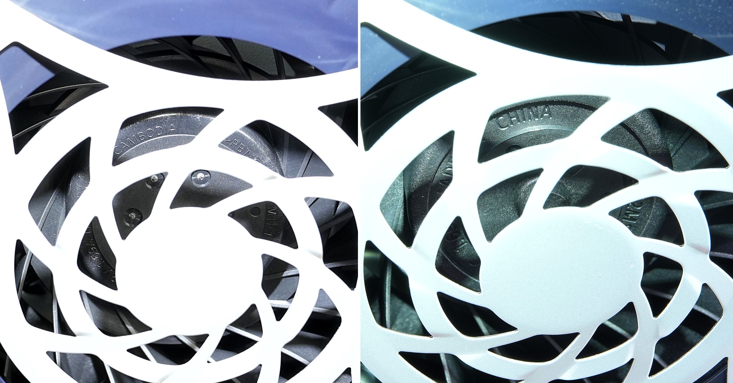 見分け方として、左側面(横置き時上側)のカバーを開いて、ファンの軸部分に型番や製造国が記載されています。形状で言うと、型番が軸の外側ギリギリに記載されているのがカンボジア製、少し内側に溝があってそこに記載されているのが中国製です。