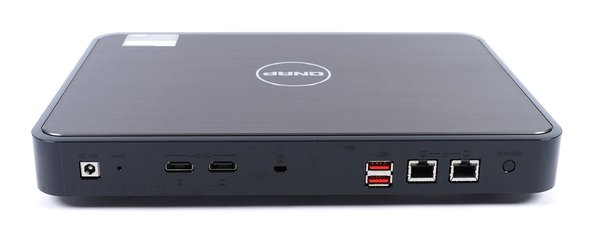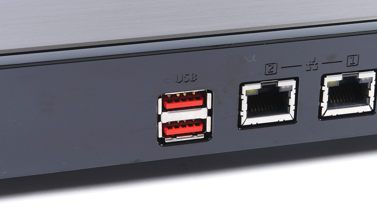 「QNAP HS-264」には背面左端に2基のUSB3.2 Gen2 Type-A端子が搭載されています。「QNAP HS-264」はメディアプレイヤー的な使い方も想定された機器なのでマウス・キーボードの接続用USBポートとしてもしようできますが、帯域10GbpsのUSB3.2 Gen2に対応しているのでUSBストレージ用としても活躍します。