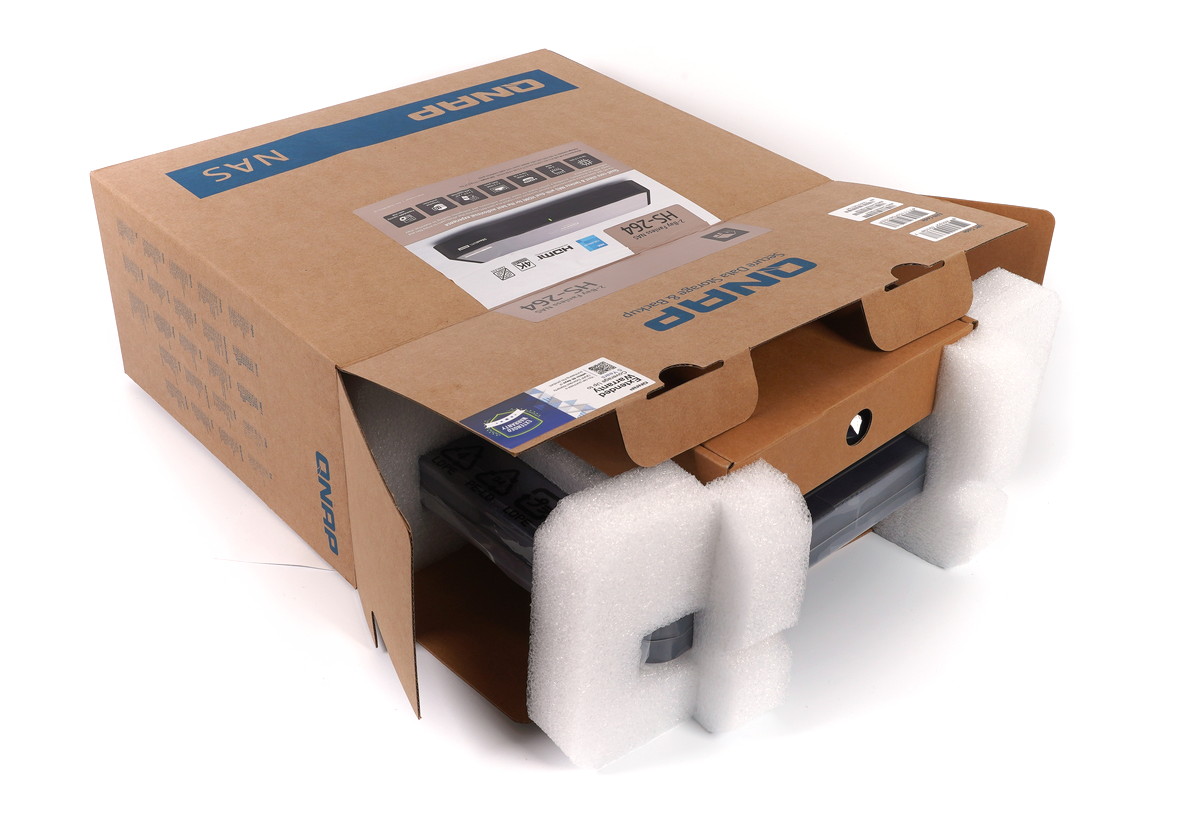 「QNAP HS-264」は黒字で簡単にメーカーロゴが刻印され、製品シールが貼り付けられた茶箱パッケージによって梱包されており、製品本体はスポンジ製スペーサーで保護されていました。付属品は小分けの茶色の段ボール箱に入っています。