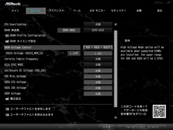 メモリ周波数が6000MHz程度(UCLK 3000MHzとFCLK 2000MHz)であれば、CPU SOC電圧の目安は1.100V程度です。Auto設定だと1.300~1.350Vくらいに昇圧されることがあるので注意。