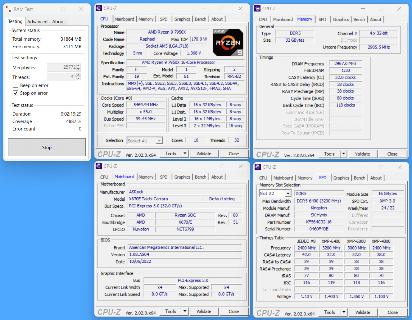 ASRock X670E Taichi Carraraを使用した検証機では16コア32スレッドRyzen 9 7950XをPrecision Boost Overdrive 2のCurve Optimizerによって全コア5.2~5.3GHzにクロックアップし、メモリも6000MHz/CL30にオーバークロックして安定動作させることができました。