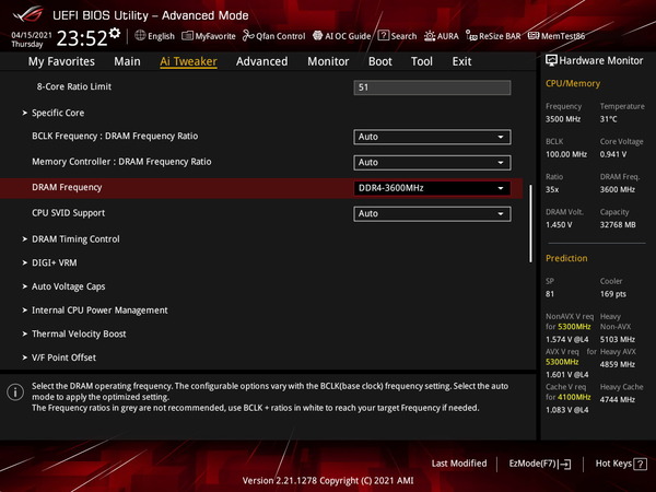 ASUS ROG STRIX Z590-I GAMING WIFIの環境(BIOS:0704)においてメモリのオーバークロックを行ったところ、メモリ周波数とメモリタイミングだけのカジュアル設定で、メモリ周波数を3600MHz、メモリタイミング:14-15-15-35-CR2の高速周波数&低レイテンシで安定動作を確認できました。1枚当たり16GB容量のメモリモジュールでもしっかりと安定しました。