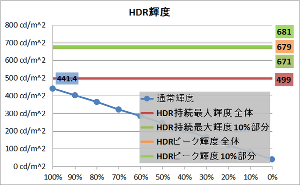 なおHDR映像ソースにおいて可変バックライトを無効化すると最大輝度は条件問わず440cd/m^2程度で固定となり、SDR表示において輝度設定を100%にした時と同等の状態になります。