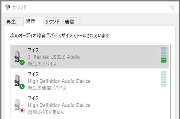 内蔵マイクはUSBアップストリームケーブルで接続したPCから使用でき、PCからは「Realtek USB2.0 Audio」という名前で認識されます。Windows10環境であればプリインストールの汎用ドライバで動くのでプラグアンドプレイで使用できます。