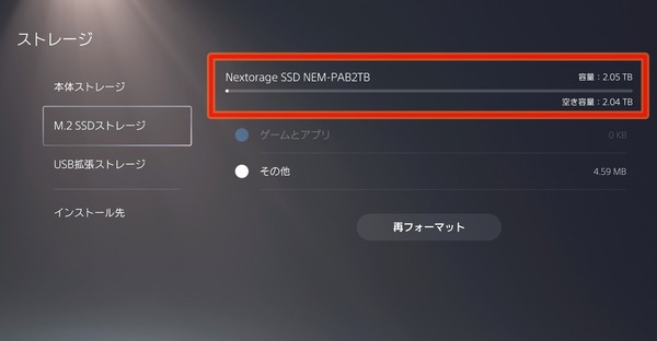 「Nextorage NEM-PAB」の2TB容量モデルをPS5の増設ストレージに使用すると2.05TBを新たにストレージとして使用できました。