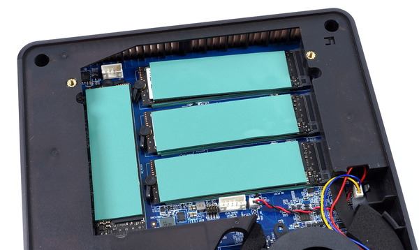 「QNAP TBS-464」の前方を奥(上)に向けて、左側にSSDを設置する4基のM.2スロット×4が設置されています。