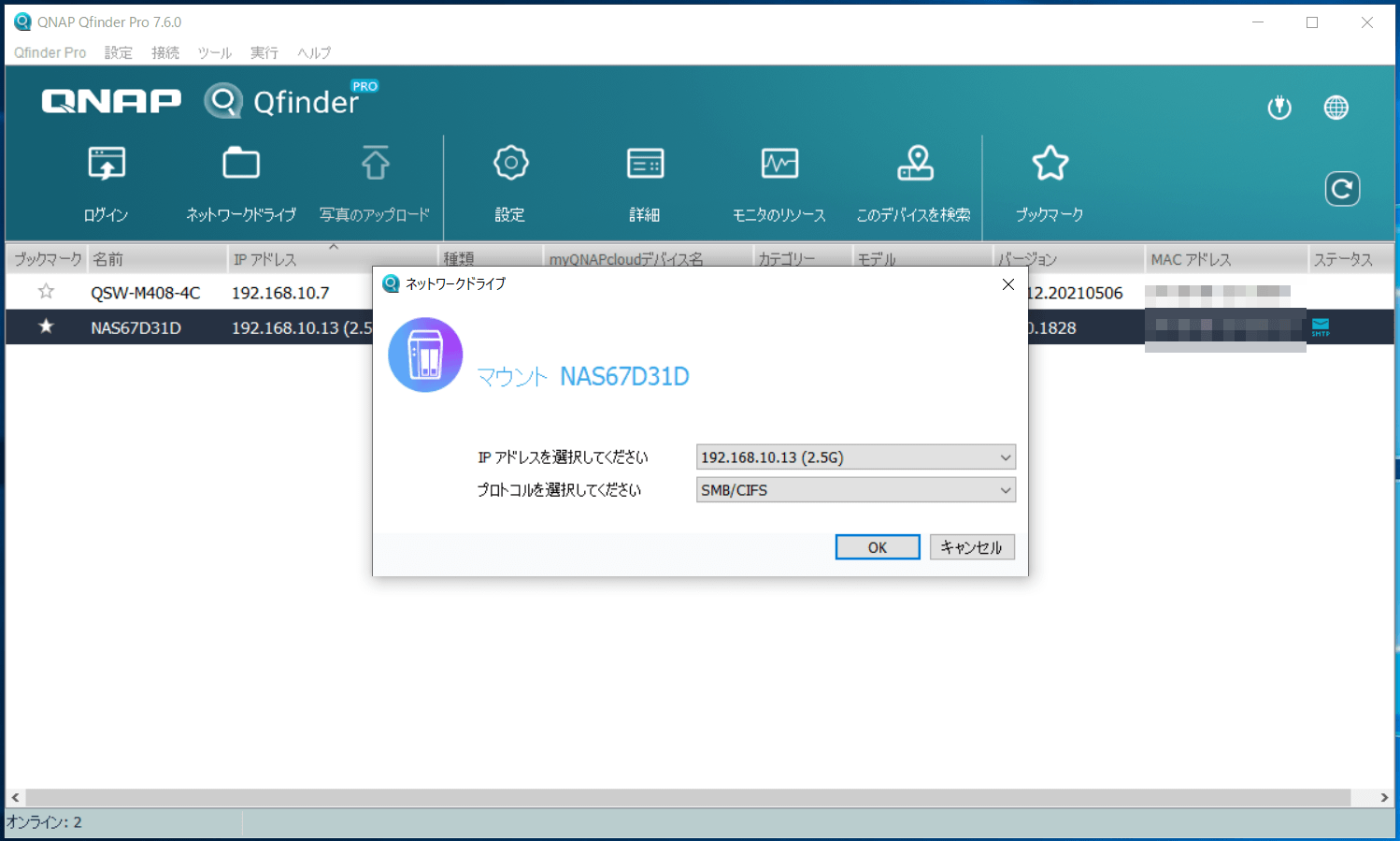 ドライブパスを通す作業はQNAP Qfinder Proから行います。直前の共有フォルダ作成で紹介したばかりなので、「Storage Plus & Connect」を使用した方法を紹介すると、パスを通したい共有フォルダに対して右クリックメニューを開き、「接続」を選択するだけです。