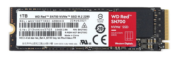 QNAP TBS-464はNVMe M.2 SSDに対応した4ストレージベイ搭載NASなので、今回、NASに組み込む検証機材用SSDとして、Western Digitalから発売中のNAS向けNVMe M.2 SSD「WD Red SN700 NVMe SSD 1TB」を使用しています。