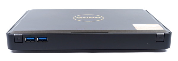「QNAP TBS-464」の天板中央にはゴールドでQNAPのロゴが描かれています。