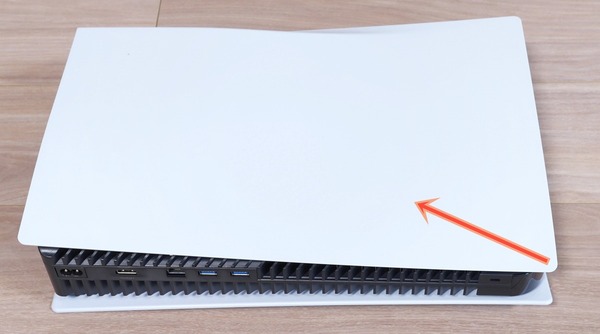 PS5でカバーが取り外し方向へスライドしないようにロックしているのは、縦置きした時に上側奥に当たる角にある2つの丸形の出っ張りだけなので、ここを外に引っ張って浮かせ、縦置き時の下方向へカバーを押すor引くと簡単に外れます。
