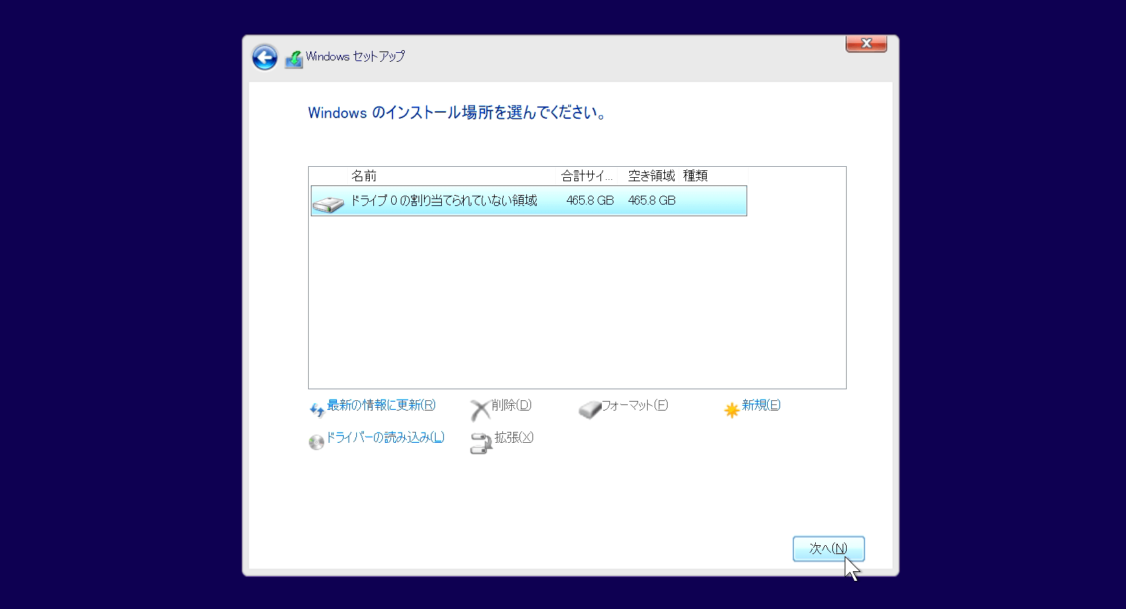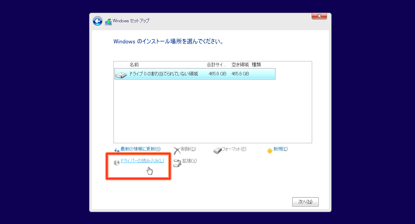 使用するドライバファイルをOSインストールメディアにコピーしたら、通常通り、そのOSインストールメディアを使用してOSのインストールを開始し、OSのインストール先ドライブ選択まで進めます。