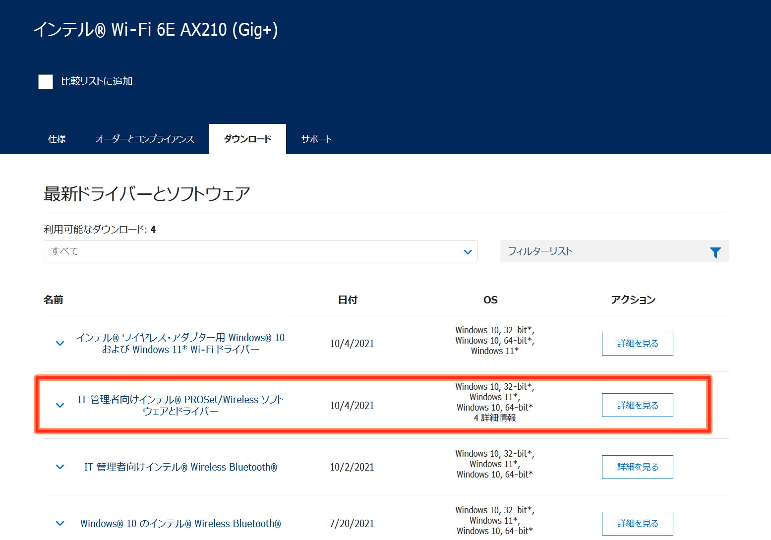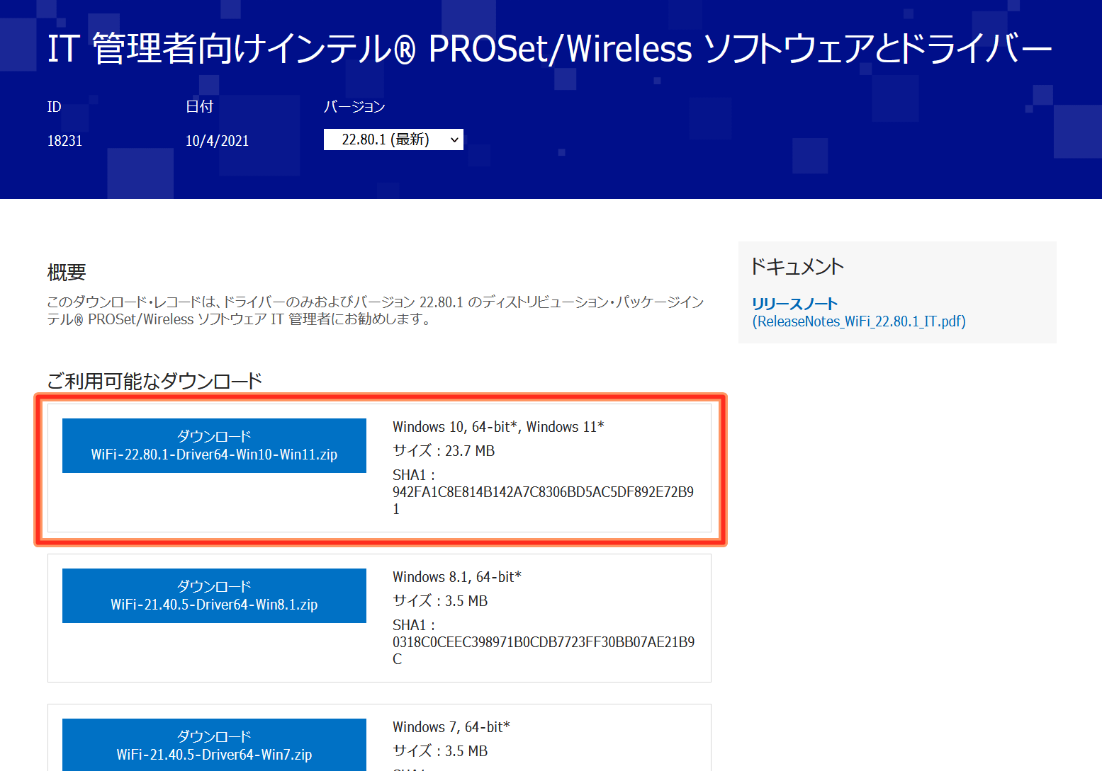 『IT 管理者向けインテル® PROSet/Wireless ソフトウェアとドライバー』の方を開いて、Windows 11用かつx64形式のドライバのZip圧縮ファイルをダウンロードします。