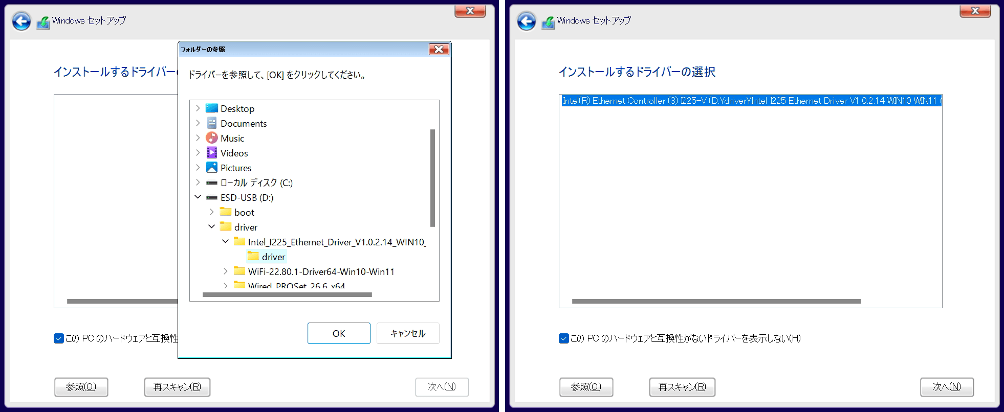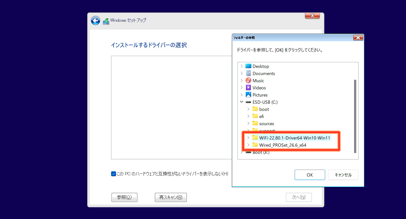 見慣れたエクスプローラーが表示されるので、OSインストールメディア(ESD-USB)を開いて、先ほどコピーしたドライバフォルダを選択し、OKをクリックします。