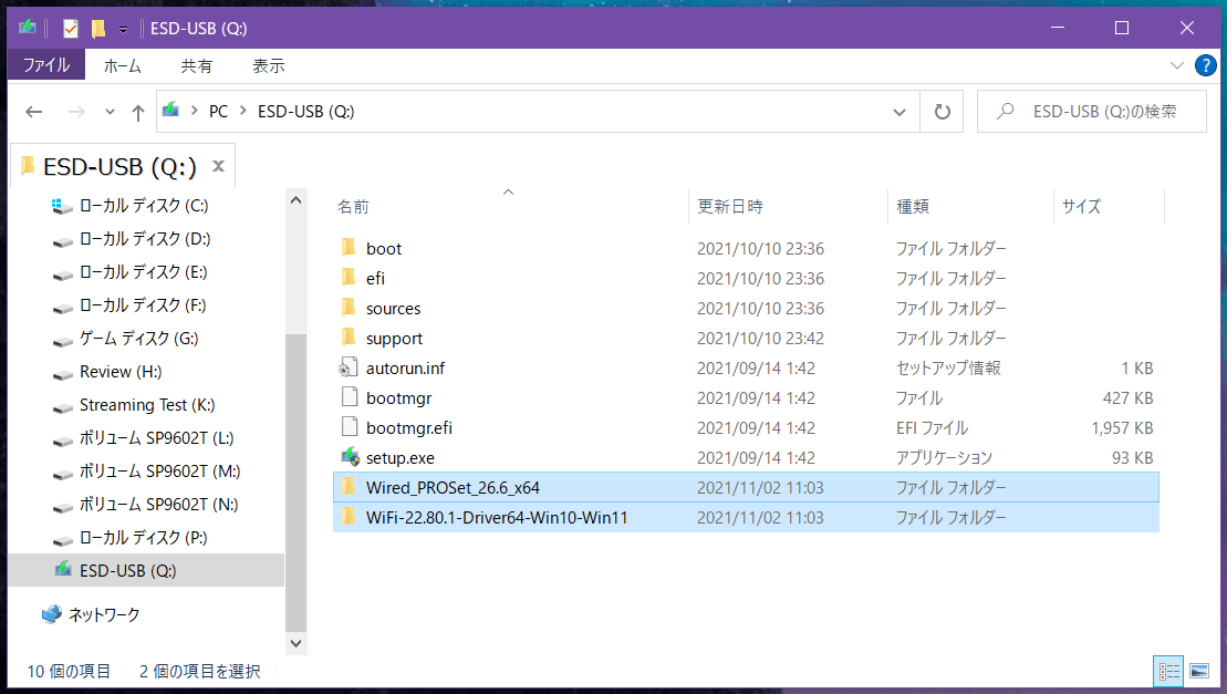 Windows 11標準ドライバで動作しないネットワークアダプタのドライバを公式ページやマザーボードのサポートページからダウンロードしたら、USBインストールメディアのルートに圧縮ファイルを解凍したフォルダをコピーします。