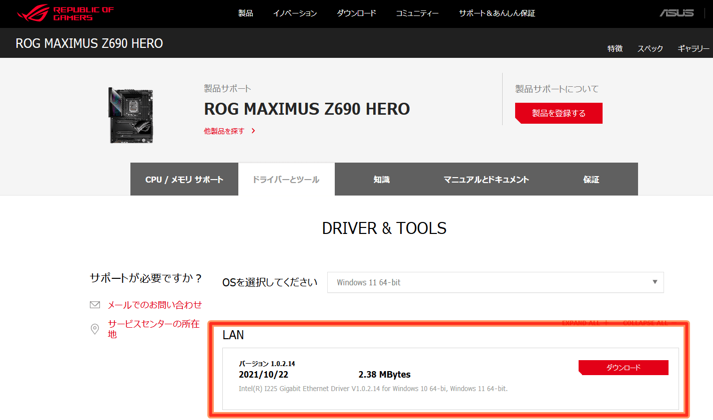 一例として挙げているリンクはASUS ROG MAXIMUS Z690 HEROのものですが、他社製マザーボードでもI225-V用ドライバについては使用しても問題ないはずです。各自で使用しているマザーボードのサポートページに上手くいくドライバがない場合は試してみてください。