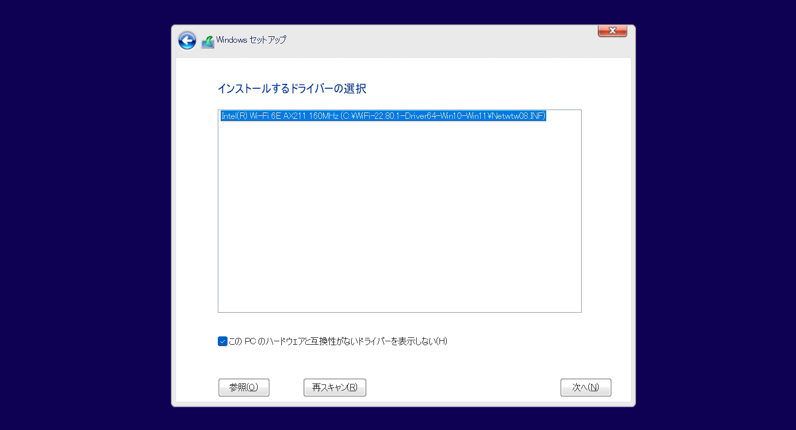 選択したフォルダ内のドライバは自動的に検索されて、該当するものがあれば表示されるので、「次へ」をクリックしてドライバをインストールします。