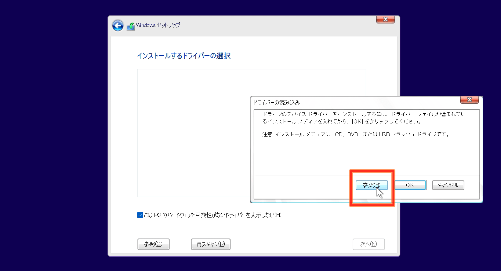 ドライブ一覧の左下にある「ドライバーの読み込み」を選択すると、ポップアップウィンドウが表示されるので、「参照」を選択します。