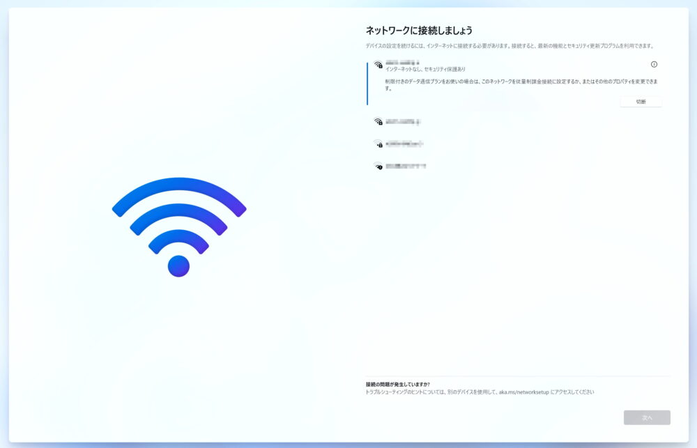 ドライバを正常にインストールできていれば、OSの初期設定でネットワークアダプタ(接続先)が表示され、インターネット接続が成功していれば初期設定を進められるはずです